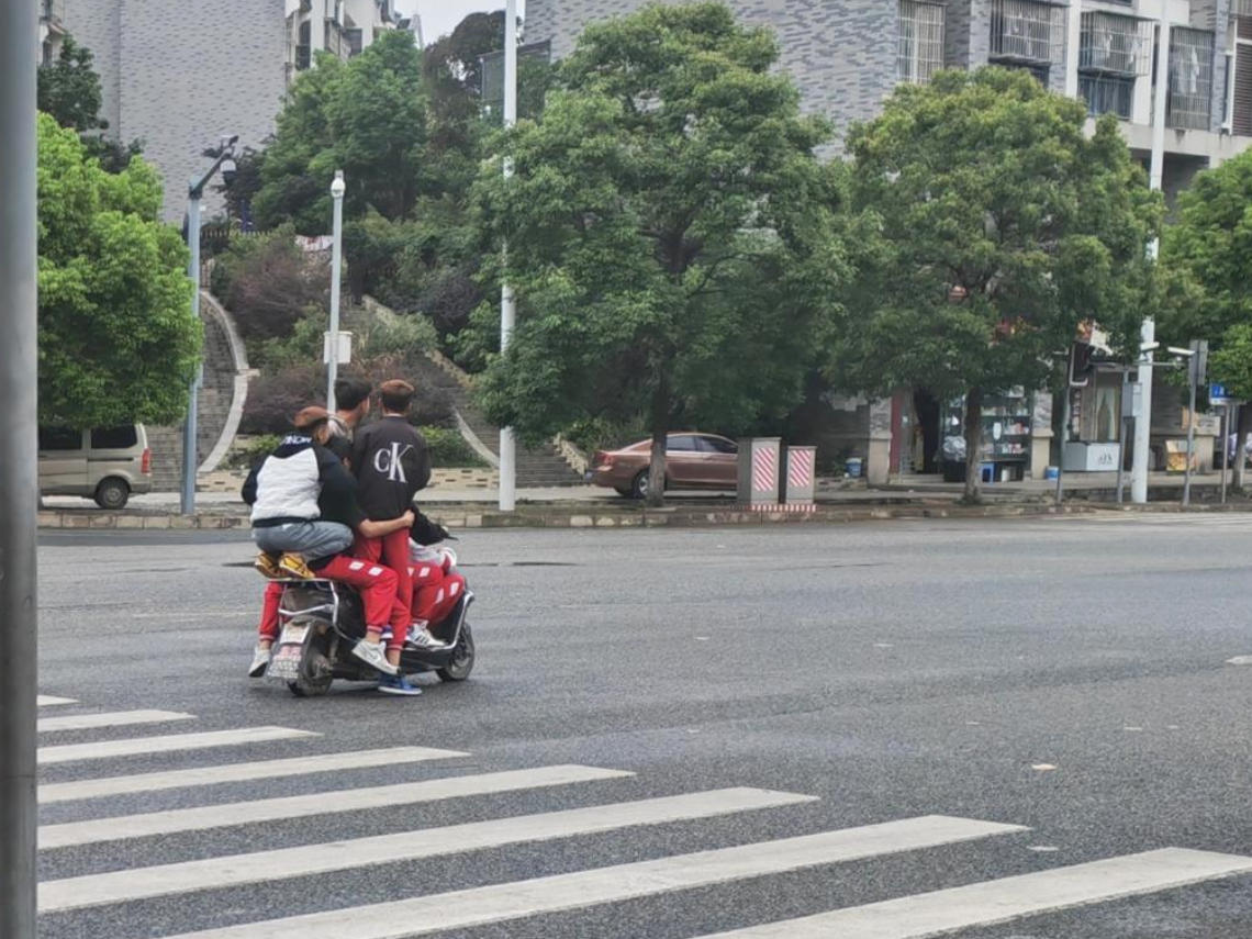 2025年5月,在西部某乡镇中学附近,多名未成年人同乘一辆电瓶车。