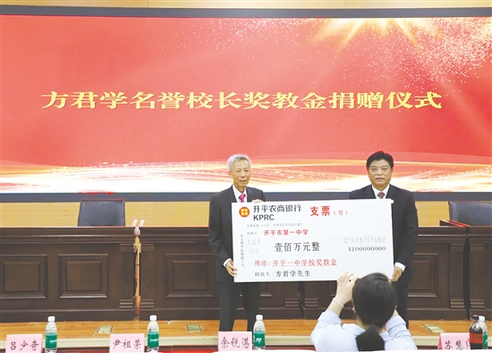 开平一中名誉校长方君学捐赠百万元奖教金。