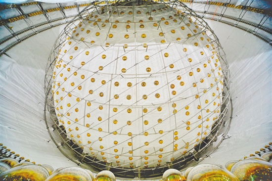 2025年8月26日,江门中微子实验(JUNO)成功完成2万吨液体闪烁体灌注,并正式运行取数。图为位于水池内(尚未灌水)的中心探测器(外部图)。