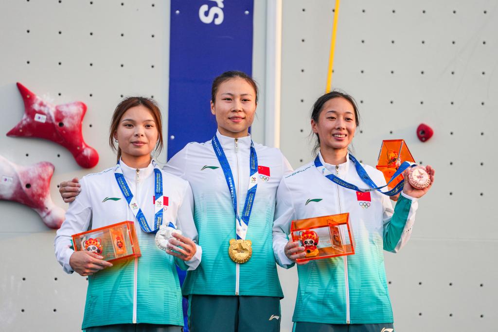 8月14日,2025年成都世运会攀岩女子速度个人赛中,中国选手包揽奖牌。图为邓丽娟(中)、覃于妹(左)和周娅菲在颁奖仪式上合影。新华社记者 丁增尼达 摄