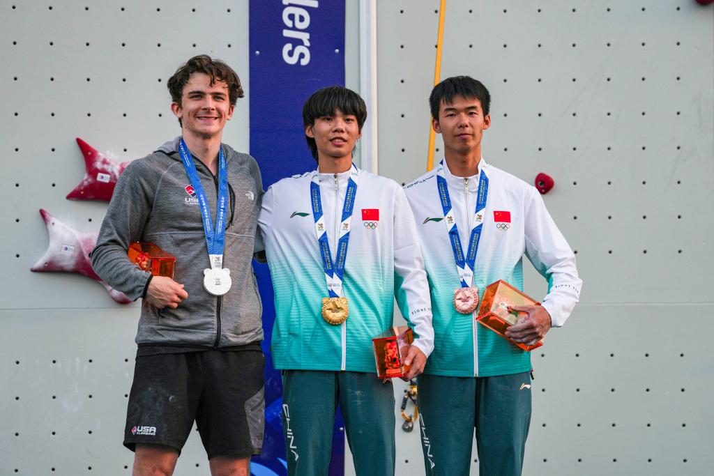 8月14日,冠军中国选手储守宏(中)、亚军美国选手沃森(左)和季军中国选手龙见国在攀岩男子速度个人赛颁奖仪式上合影。新华社记者 丁增尼达 摄