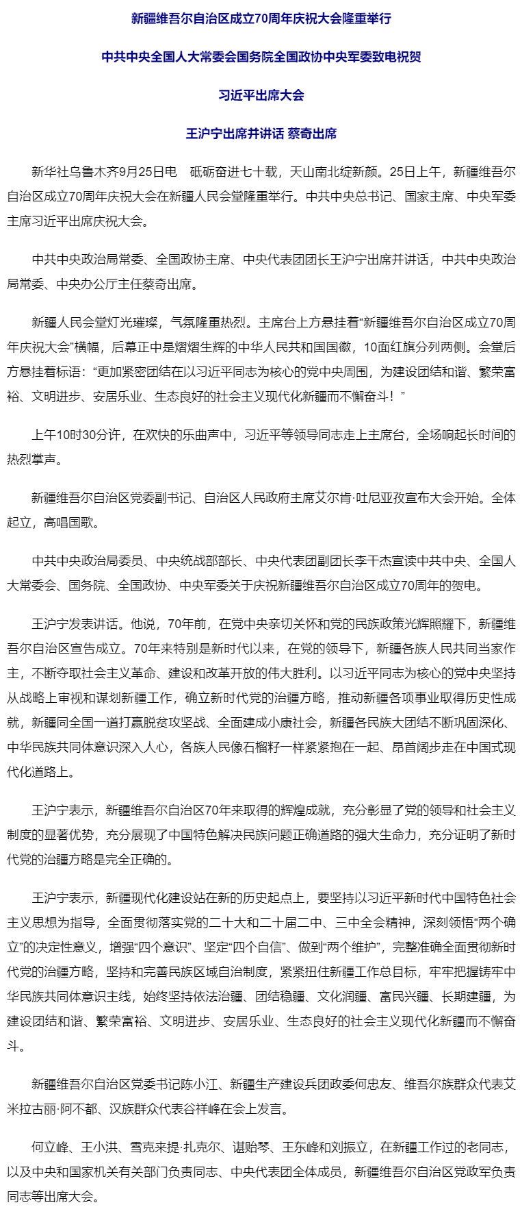 新疆维吾尔自治区成立70周年庆祝大会隆重举行 习近平出席大会