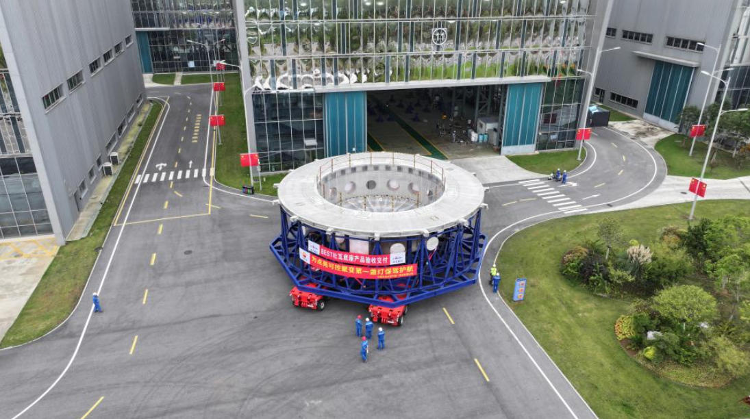 10月1日上午,位于安徽合肥未来大科学城的紧凑型聚变能实验装置(BEST)建设现场传来好消息:该装置主机首个关键部件——杜瓦底座成功落位安装,标志着项目主体工程建设步入新阶段,部件研制和工程安装开启“加速度”。