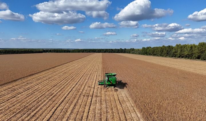 2025年9月19日,在北大荒集团黑龙江格球山农场有限公司大豆地块,收获机车在进行收获作业(无人机照片)。新华社发(陆文祥摄)