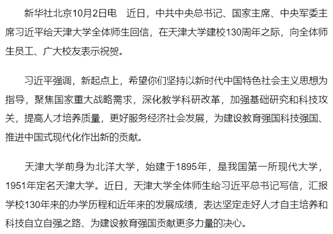 习近平给天津大学全体师生回信强调 聚焦国家重大战略需求提高人才培养质量 更好服务经济社会发展