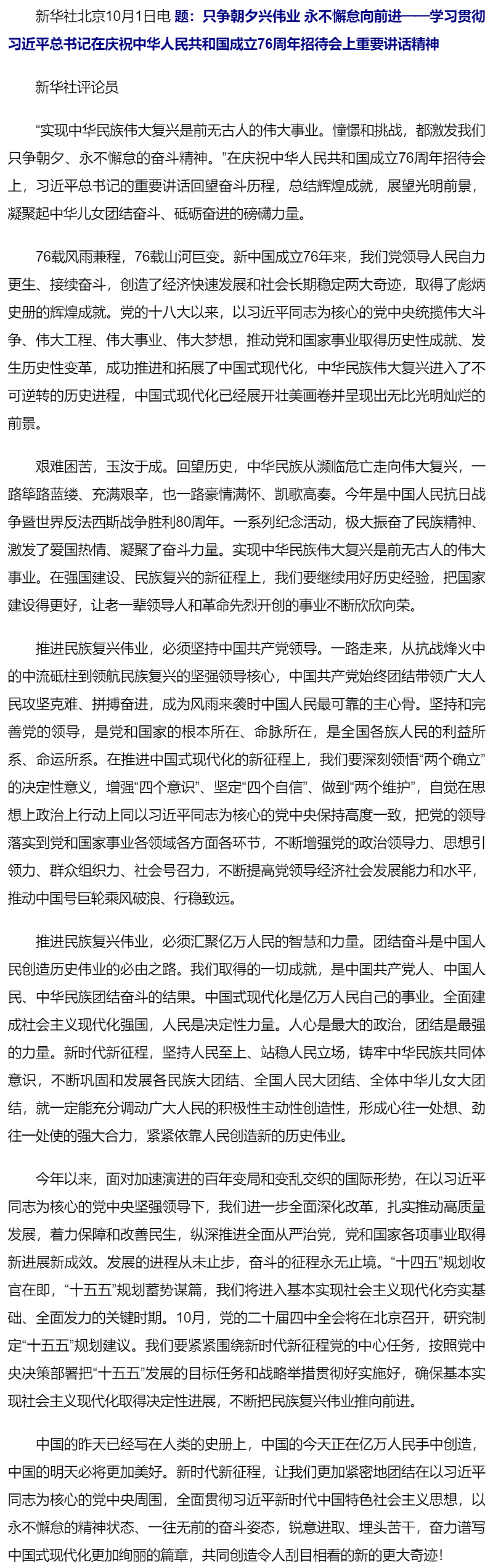 新华社评论员:只争朝夕兴伟业 永不懈怠向前进——学习贯彻习近平总书记在庆祝中华人民共和国成立76周年招待会上重要讲话精神
