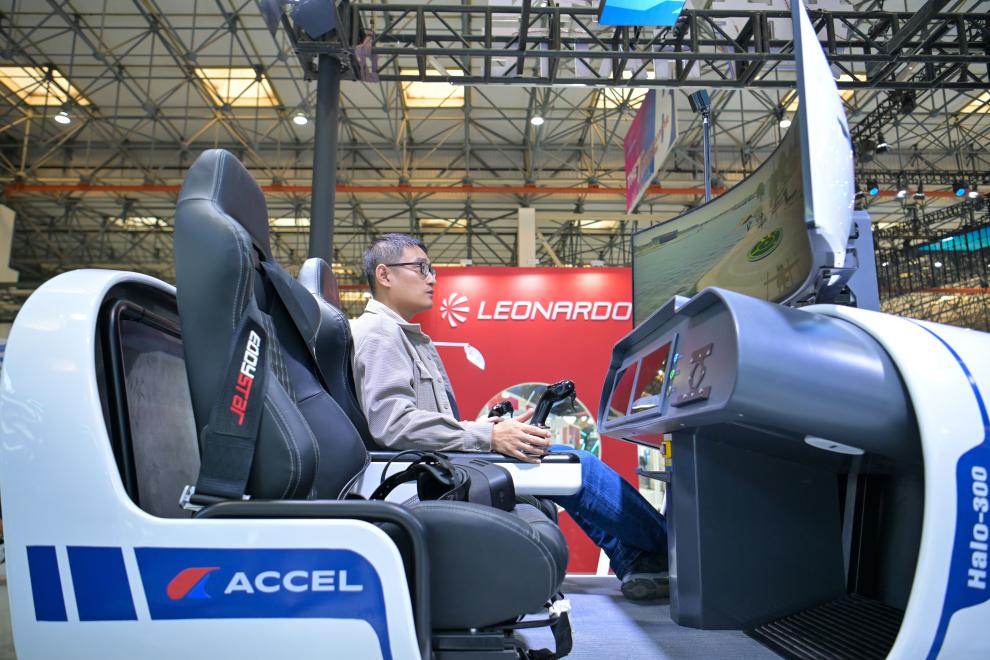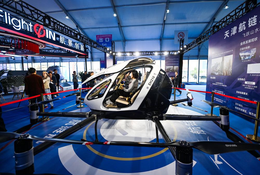 10月16日,观众在天津直博会低空经济馆内体验一款eVTOL(电动垂直起降飞行器)。新华社记者 赵子硕 摄
