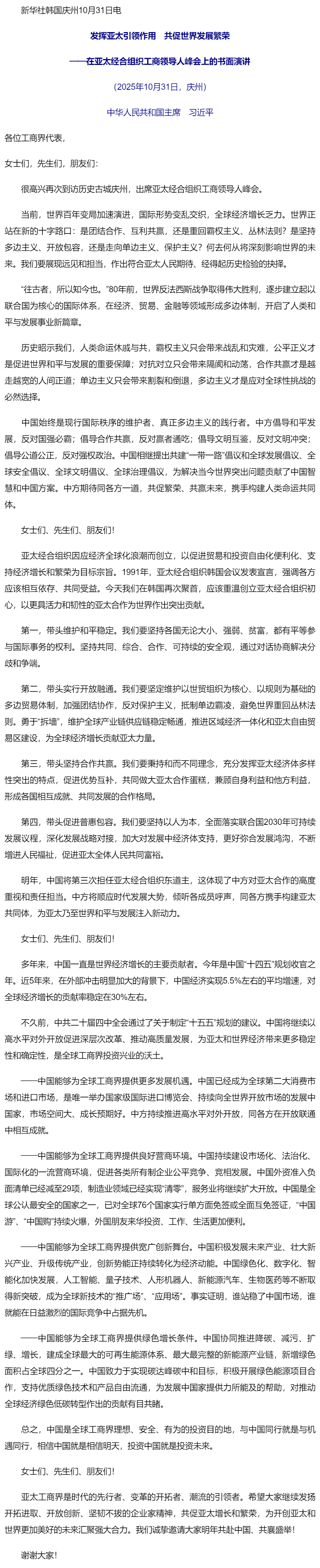 习近平在亚太经合组织工商领导人峰会上的书面演讲(全文)