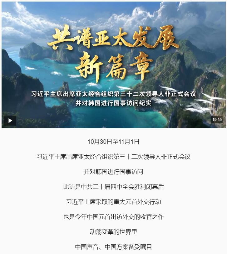 时政纪录片丨共谱亚太发展新篇章——习近平主席出席亚太经合组织第三十二次领导人非正式会议并对韩国进行国事访问纪实
