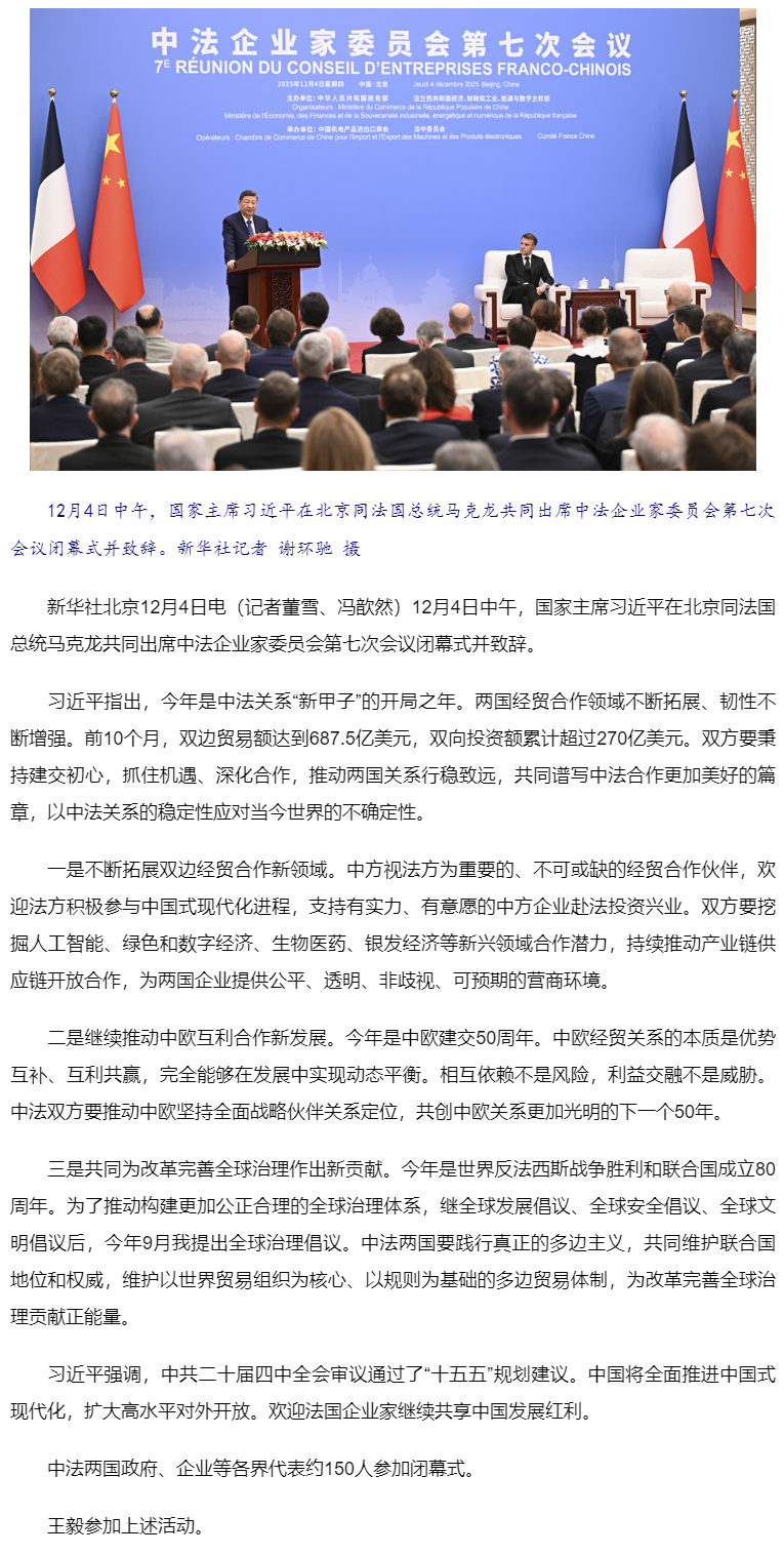 习近平出席中法企业家委员会第七次会议闭幕式并致辞