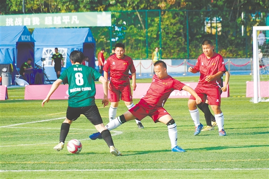 特奥足球运动员们奔跑、抢球,积极投入比赛。 郭永乐 摄