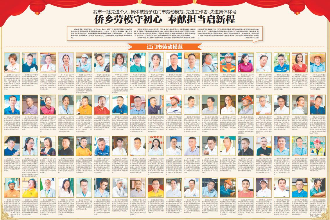 为表彰先进、树立标杆,让劳动光荣、技能宝贵、创造伟大的风尚浸润侨乡,市委、市政府授予王富春等72人江门市劳动模范称号,授予白晓晖等8人江门市先进工作者称号,授予江门市委市政府总值班室等40个集体江门市先进集体称号。这份荣誉,是对奋斗者的崇高礼赞,更是对全市广大职工群众的奋进号召。相信在先进力量的引领下,侨乡大地将进一步激荡劳动热情、凝聚奋斗力量,为建设现代化新侨都注入不竭动力。文/图张浩洋 江工宣