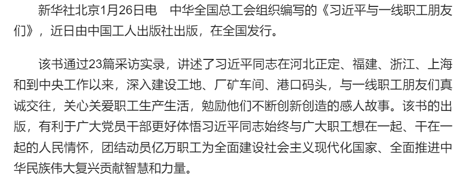 《习近平与一线职工朋友们》出版发行