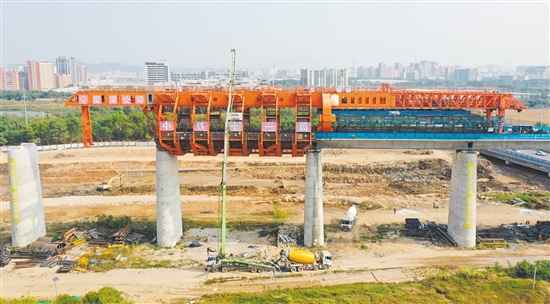 1月28日,中铁十一局承建的深江铁路跨沿江高速特大桥移动模架现浇简支梁施工任务过半,建设有序推进。深江铁路是我国“八纵八横”高铁网沿海通道的重要组成部分,线路起自深圳西丽站,正线全长116公里,跨越珠江口,串联深圳、东莞、广州、中山和江门5座城市。工程建成后,深圳与江门可实现1小时内通达。图为1月28日在东莞市滨海湾新区拍摄的深江铁路跨沿江高速特大桥移动模架现浇简支梁施工现场(无人机照片)。