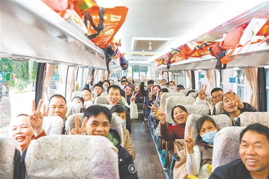 昨日,52名在江门新会务工的广西崇左宁明县职工及家属乘坐新会“幸福大巴”开心返乡。