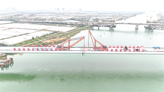 江门日报讯 (文/图 毕松杰 李志强) 近日,随着最后一段长6米、宽17米、重约72吨的钢梁精准吊装到位,国内首座大跨度双边主梁混合组合梁高速铁路斜拉桥——深江铁路广中江特大桥跨鸡鸦水道主桥顺利合龙(上图),成为深江铁路全线首个实现合龙的主桥,为全线后续架梁、铺轨等施工奠定了坚实基础。