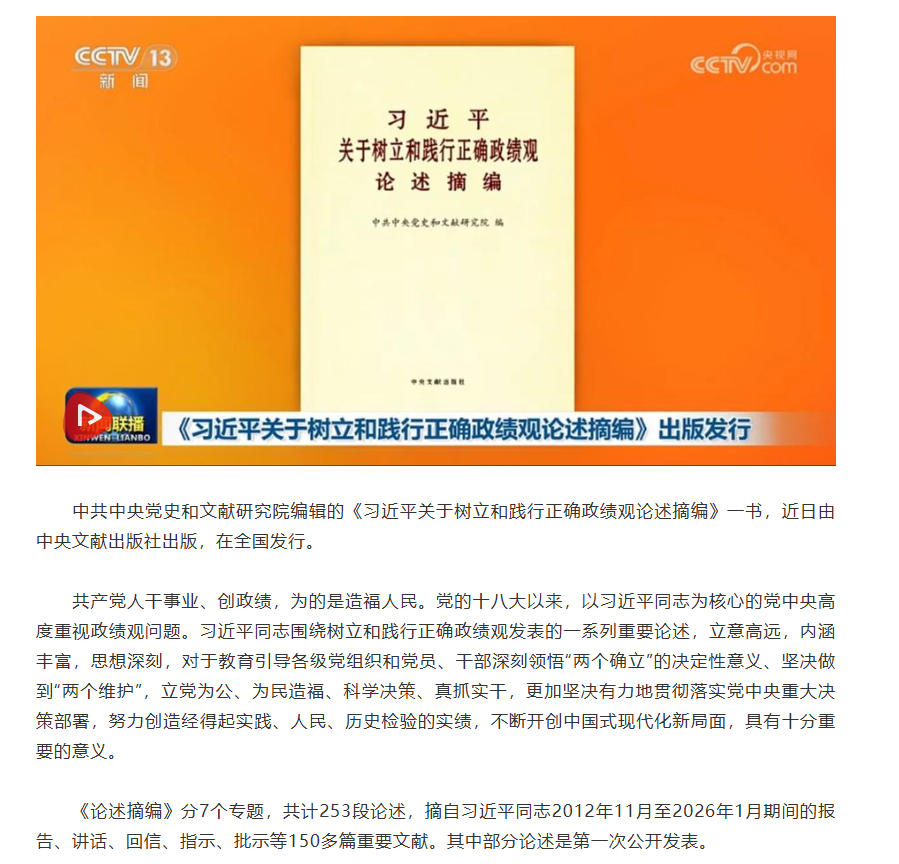 《习近平关于树立和践行正确政绩观论述摘编》出版发行