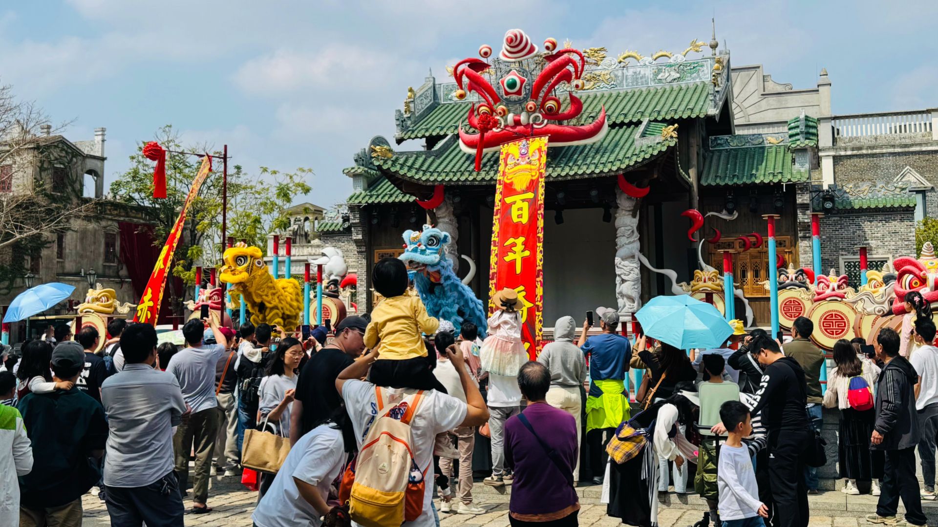大年初七早上,他们又来到赤坎华侨古镇。相较于假期高峰时一天有5万多人的热闹,春节假期最后一天的景区格外“友好”。不用排队等候,一家人走走停停,在骑楼下拍照,在池塘边喂锦鲤,从容又惬意。更让人惊喜的是,景区里的簕杜鹃开得正盛,嫣红的花朵铺满墙头,整个古镇仿佛被鲜花包裹。随处可见的马年花牌、喜庆的新年装饰,让年味愈发浓厚,雄狮少年的精彩表演、惊险刺激的环球飞车,更是让孩子们看得目不转睛。