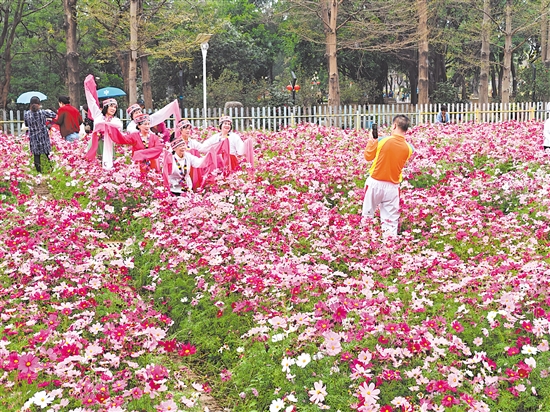 据公园负责人介绍,去年12月,工作人员播下10斤约30万粒花种,经过灌溉、养护,才有了今日的规模。除了格桑花,公园里的木棉花、簕杜鹃、黄花风铃木也竞相盛放,市民可以在花海中畅游,在碧波荡漾的东湖边散步,或在湖畔长廊小憩,沉浸式体验“城在园中,园在景中”的悠然意境。