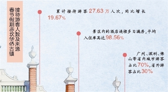 今年春节,赤坎华侨古镇内的酒店、民宿连续多日满房,平均入住率高达98.56%,广州、深圳、佛山等省内城市游客占比达70%,省外及港澳客源稳步增长,景区停车场内各地车牌随处可见,越来越多的游客选择留宿古镇,让“半日游”“一日游”变为“深度游”。
