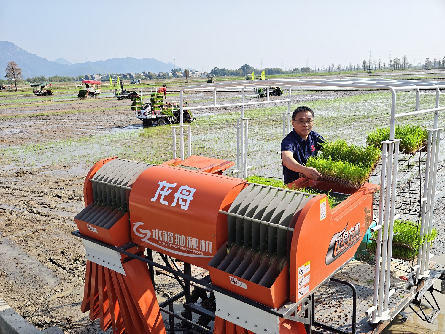 工作人员现场演示使用水稻抛秧机。郭永乐 摄