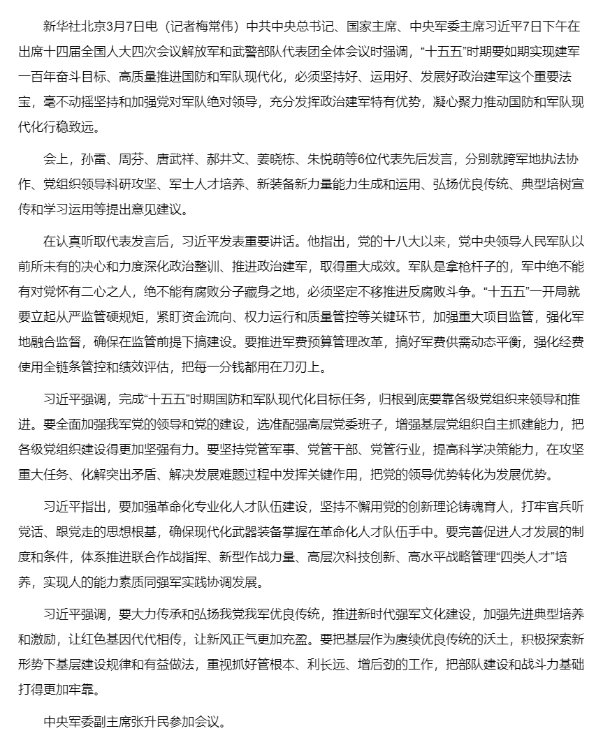 习近平在出席解放军和武警部队代表团全体会议时强调 充分发挥政治建军特有优势 凝心聚力推动国防和军队现代化行稳致远