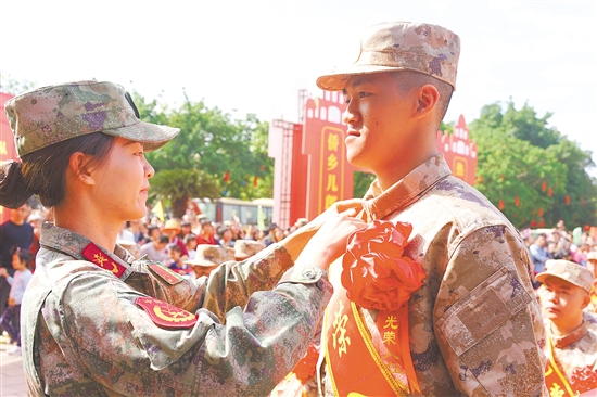 今年,江门首次组织新兵巡游。在长堤历史文化街区,新兵们接受着乡亲们的注目。锣鼓声震得人耳朵嗡嗡响,醒狮在人群中翻腾,孩子们骑在父亲肩上,咿咿呀呀地拍手。来自五邑大学的女兵温泳诗站在队伍里,看了一眼那些醒狮,又低下头,看自己胸前的大红花。今天,她是新兵中的一员。“激动,更多的是期待。我要走进军营,磨炼自己。”她笑起来,露出两颗小虎牙。