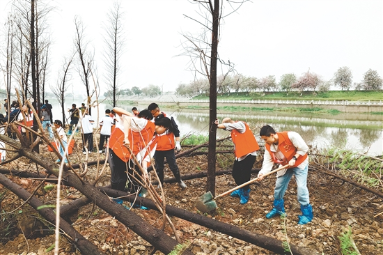 随后,绿化专家现场讲解落羽杉种植技巧,细致拆解每个环节,为大家提供专业指导。讲解结束后,各界青年代表迅速行动起来,大家挥锹铲土、扶苗正干、踩实浇水,在河畔种下一棵棵挺拔的落羽杉,为春日的河道岸线勾勒出一道绿色风景线。