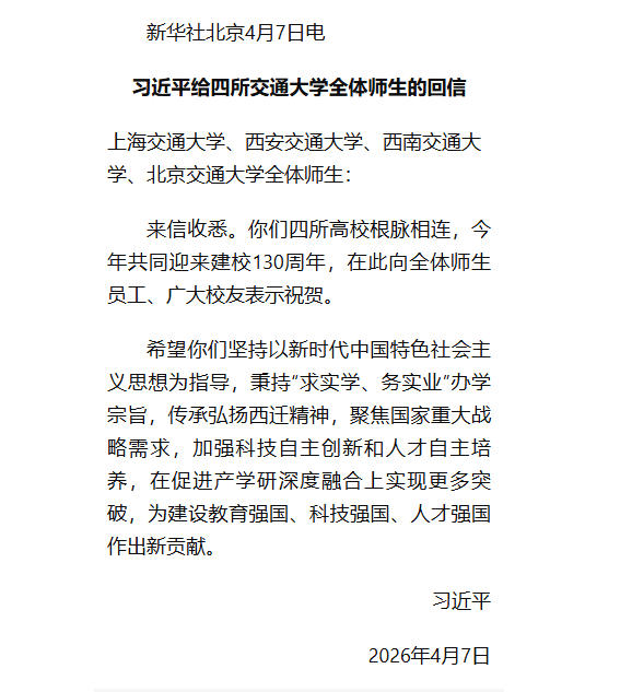 习近平给四所交通大学全体师生的回信