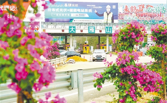 在大雁山高速出入口,道路两侧的簕杜鹃等植物为城市门户增色。