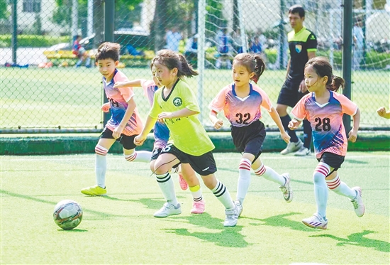 乡镇小学的足球氛围同样浓厚。蓬江区棠下镇天河小学目前有559名学生和37名教师,校园足球氛围浓郁。该校将足球纳入必修课程,每周开设一节足球课,同时建立足球兴趣小组和各级代表队,系统开展课余训练。“学校成立由校长牵头的领导小组,将足球发展纳入年度工作计划,并制定了相关管理制度。师资方面配齐体育教师,保障其待遇,完善场地设施,设立体育专项经费。”棠下镇天河小学相关负责人介绍。