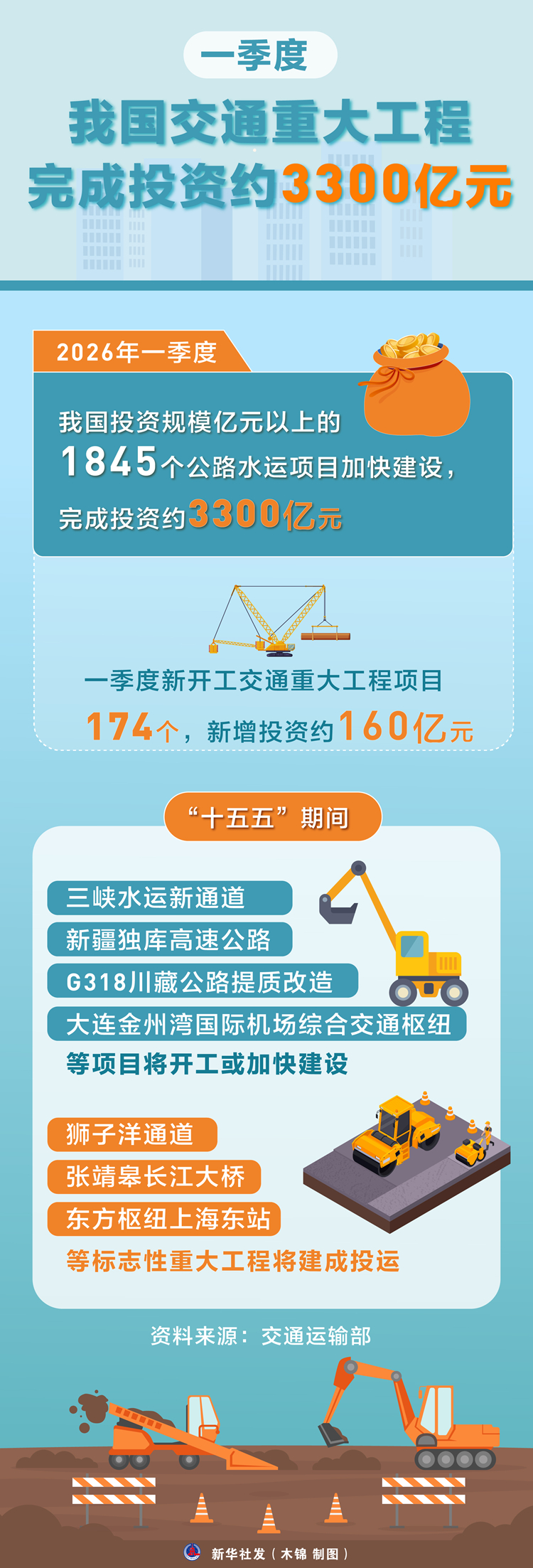 交通运输部综合规划司副司长刘东介绍,一季度新开工交通重大工程项目174个,新增投资约160亿元。江苏苏通第二过江通道、四川南江至三台高速公路、甘肃S35景泰至礼县高速公路等投资规模超200亿元的交通重大项目开工建设。