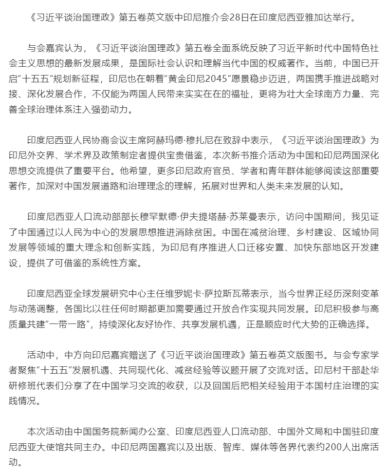 《习近平谈治国理政》第五卷英文版中印尼推介会在雅加达举行