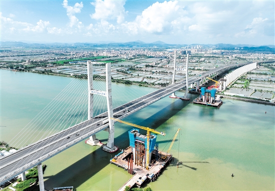 9月1日,中铁建大桥局承建的深江铁路关键性工程跨磨刀门水道主桥东主墩下横梁浇筑完成。该桥横跨中山和江门两市交界的西江磨刀门水道,主桥为140米高墩大跨斜拉桥,采用智能造塔机施工。