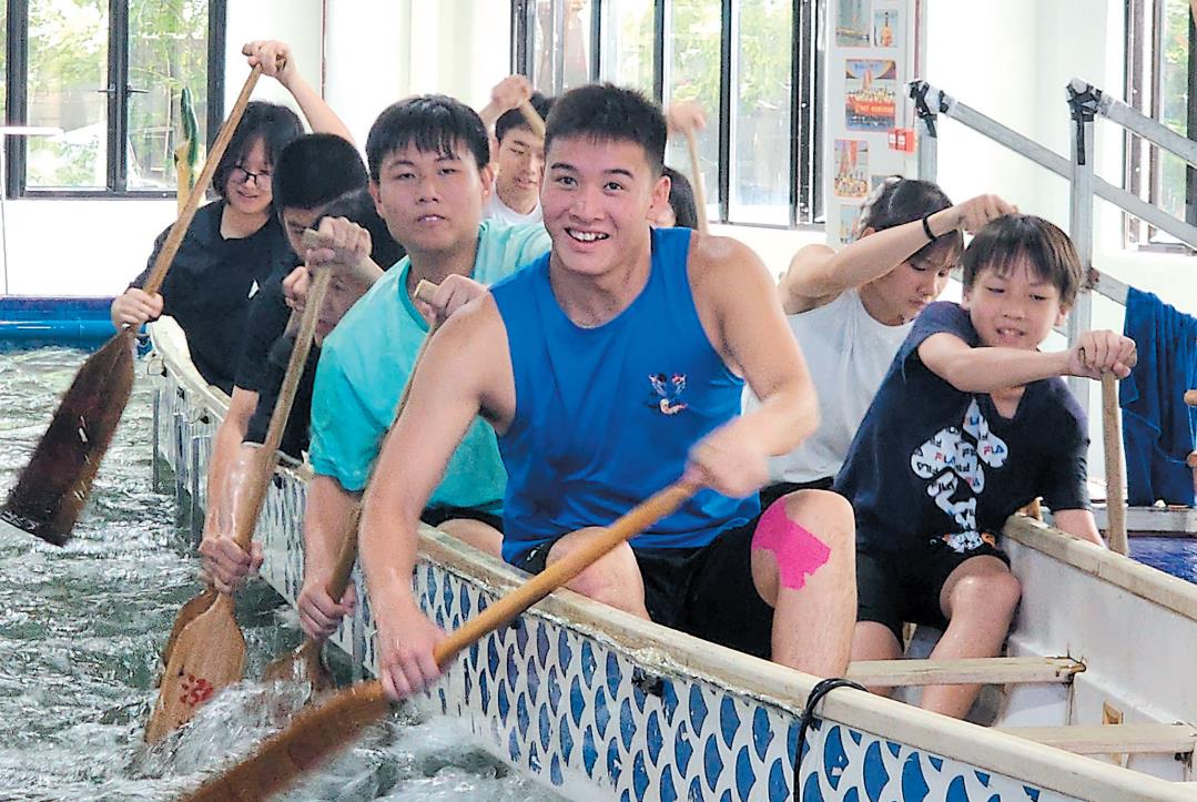 香港裘锦秋中学龙舟队队员与新会泓达堂陈皮龙舟队队员一起训练扒龙舟。