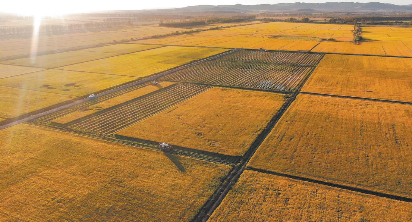 9月10日,在北大荒集团黑龙江共青农场有限公司河北庄管理区水稻地块,农机手驾驶割晒机进行割晒作业(无人机照片)。