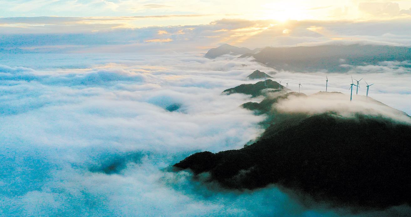 9月19日早上,记者从无人机视角见到,大隆洞水库及附近村庄被大片云海覆盖,云海仿佛有生命一般,不断地变化着形状和姿态,时而浓密如纱,时而轻盈如絮;在山风吹拂下,又犹如波浪翻涌,瀑布一样从山顶倾泻而下,与山顶的风车映衬,构成了一幅壮美的画卷。