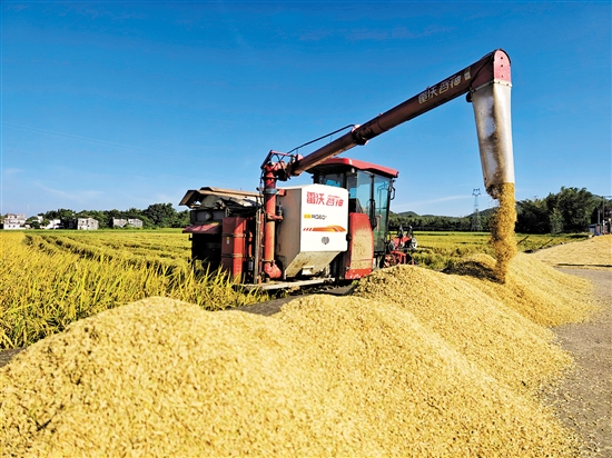 记者近日在台山市白沙镇看到,稻田里金黄的稻浪随风起伏,一片片满目金黄、层层叠叠的稻穗颗粒饱满;农机手驾驶着收割机在金色的稻浪中来回穿梭作业,一排排水稻被整齐地割下,经过脱粒、分离等流程,直接输送到田边的晒场上。机声隆隆、稻香阵阵,金黄稻田与美丽乡村相互映衬,构成一幅幅靓丽的田园画卷。