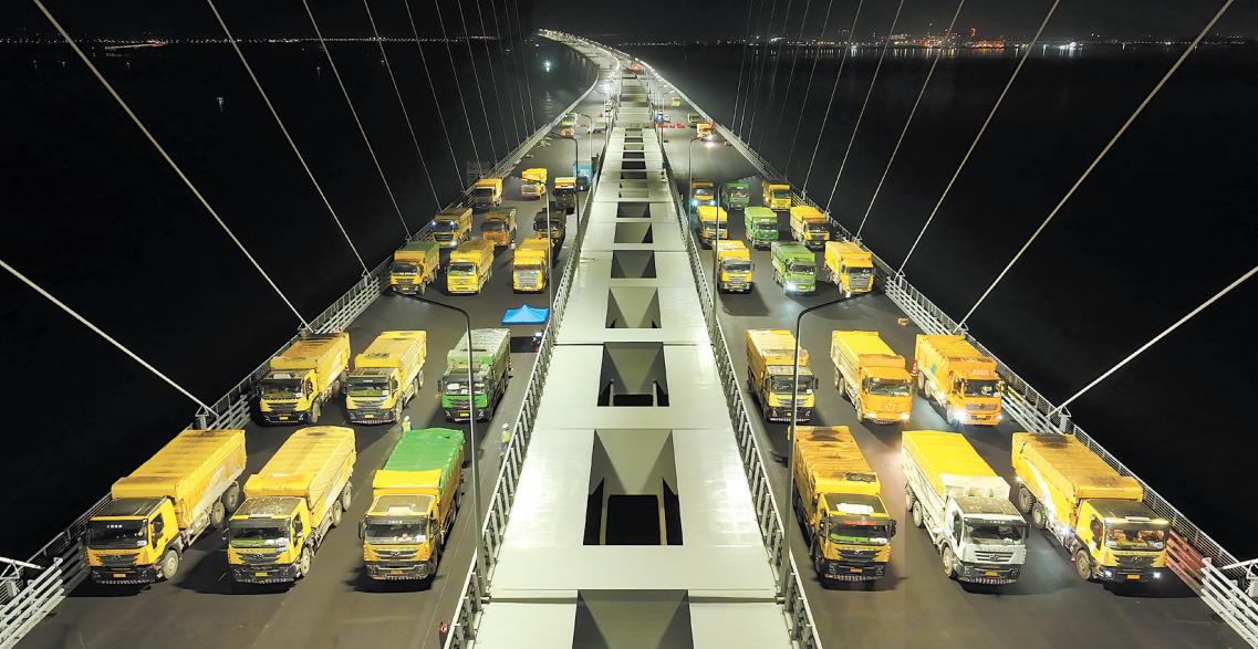 试验开始前,工作人员将170余个传感器布置在塔顶、塔底、桥面、桥墩等桥梁关键截面测点上,用于收集各种关键数据。“我们的动载试验模拟了三种行车情况,第一种是无障碍行车试验,两台重约35吨的载重汽车以不同车速在桥面行驶;第二种是有障碍行车试验,在桥面设置高7厘米的弓形板,两台重约35吨的载重汽车以不同车速越过障碍行驶;第三种是脉动试验,是在桥面无任何车辆的情况下,通过布置在桥梁上的振动传感器拾取微幅振动,经低频放大器放大信号后,用动态信号采集系统进行采样、分析。静载试验则是按照工况,在桥面指定位置分批停放载重汽车,并通过检测仪器记录参数。”中铁宝桥黄茅海跨海通道G3合同段项目经理王晓辉说道。