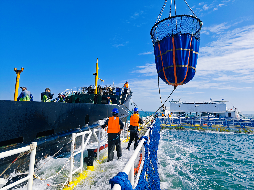 阳光洒落,上川岛海域波光粼粼。“台山1号”巍然屹立,3个巨大的网箱中,数万条鮸鱼欢快地穿梭其间。此时,满载着新一批鮸鱼良种的运输船缓缓驶来,与“台山1号”并肩而立,在工作人员的操作下,这些承载着希望的鮸鱼良种陆续被投放进网箱。