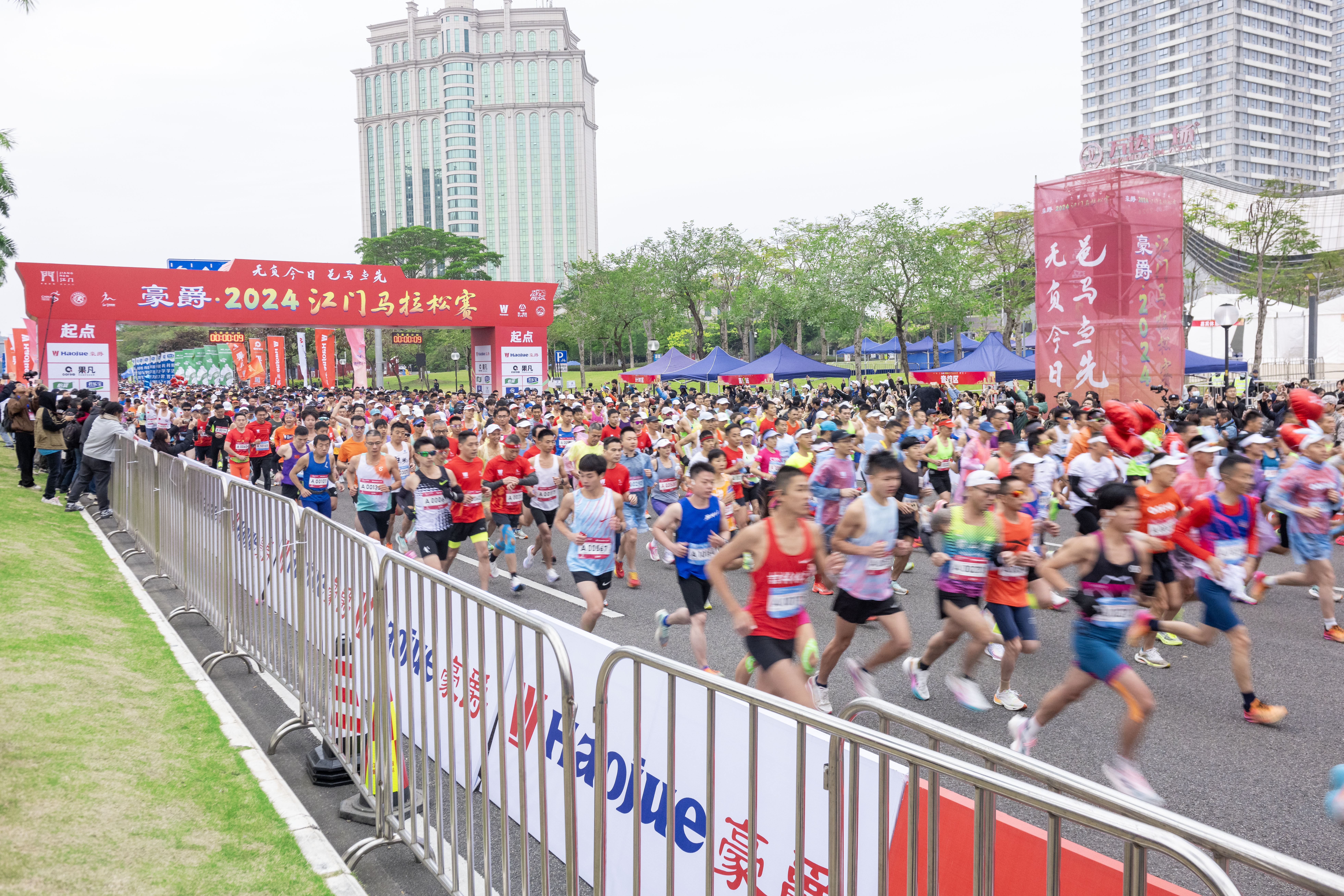 江门日报讯 (记者/陈敏锐) 跑一场马,爱一座城!12月15日7时30分,随着发令枪响,豪爵·2024江门马拉松赛正式拉开帷幕。近2万名跑者沿着风景如画的赛道尽情奔跑,用脚步丈量着中国侨都的古韵与繁华,向着终点全力冲刺,展现无限活力。市长吴晓晖,市领导陈冀、吴国杰、林健生、夏天、汤惠红,广东省田径项目管理中心主任吴舜珊,江门市大长江集团有限公司党委副书记仵岩等出席起跑仪式,为大赛鸣枪发令。