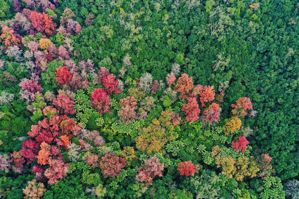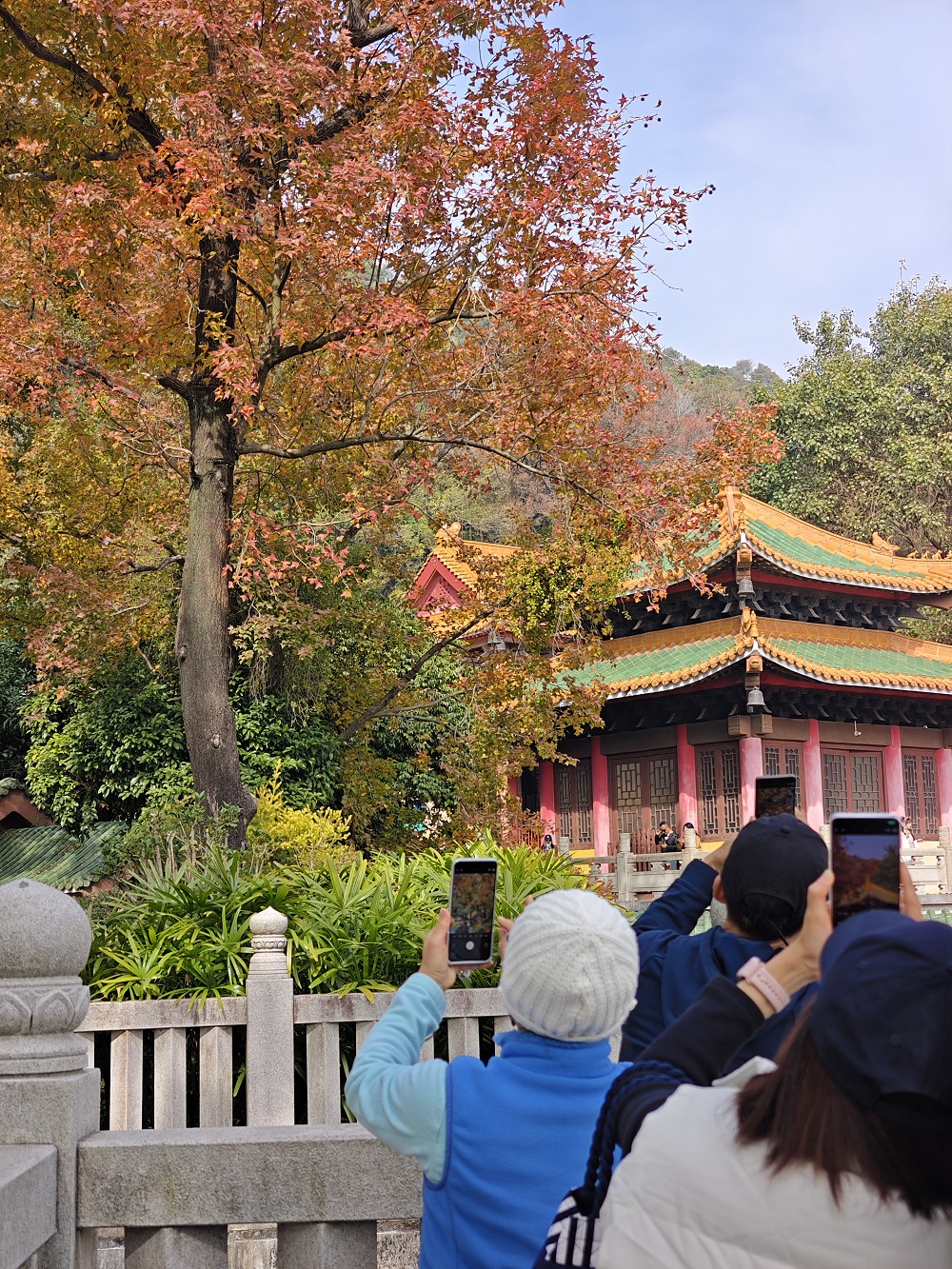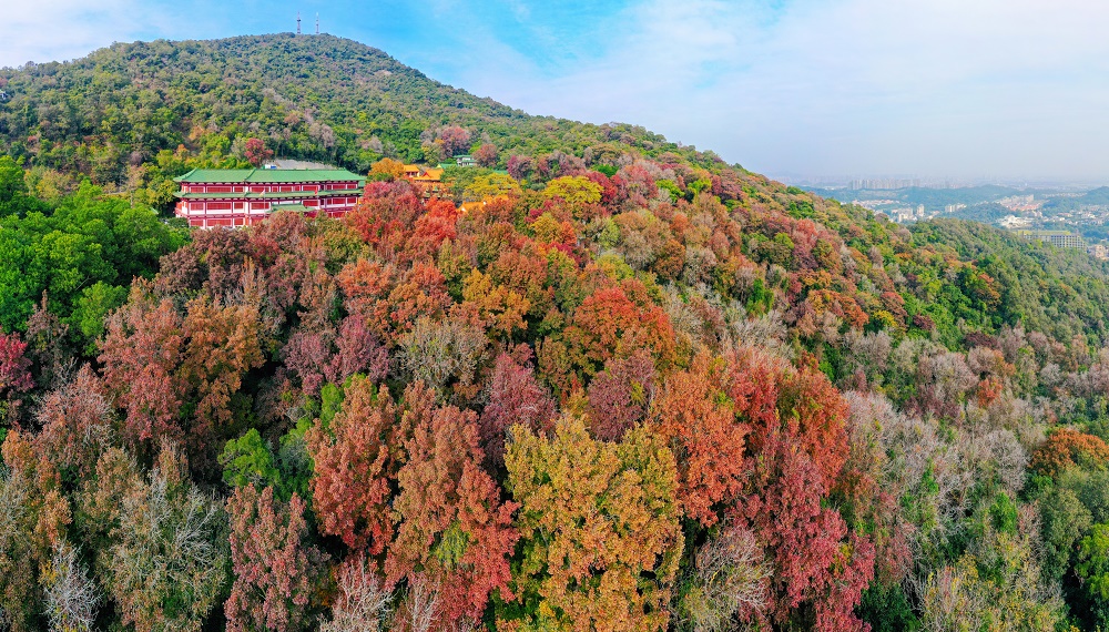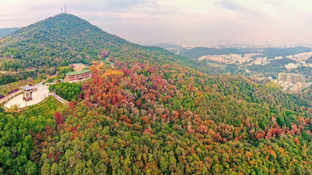 12月24日下午,记者顺着圭峰山登山古道拾级而上,山上树木高低掩映,郁郁葱葱,沿路可见枝头枫叶分外红。在太阳的映照下,粉红、桃红、鲜红、深红……好像打翻了调色盘一样,给苍郁的圭峰山增添了一分瑰丽,不少市民用手机记录下这美好一刻。