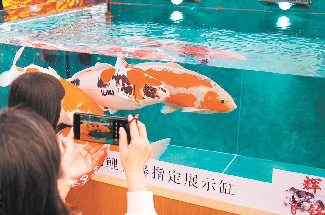 市民举起手机,定格锦鲤在水中悠然自得的优雅游姿。