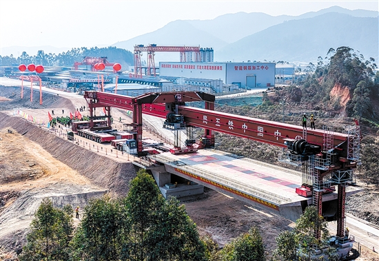 1月21日,珠肇高铁高肇段和珠江段首孔箱梁在肇庆市高要区双金河特大桥桥墩上成功架设。