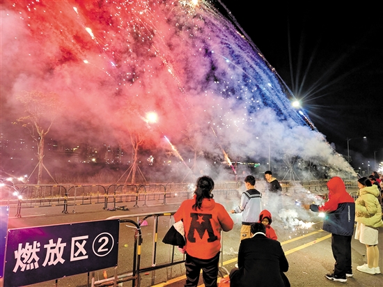 昨晚,记者在蓬江区临时烟花爆竹燃放区域——棠下镇大林路(凤翔路—丰乐大道)见到,现场设置了烟花燃放区、观看区,附近设置了2个有《烟花爆竹经营(零售)许可证》的烟花爆竹临时零售点,现场还有交警、安保、环卫等部门维持秩序和打扫卫生,市民在指定区域内有序燃放烟花。
