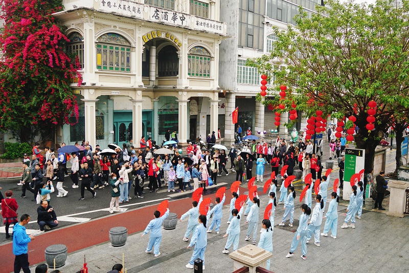 当天,活动沿途设置了20个互动点位,内容涵盖传统醒狮、武术、古琴、民乐、汉服秀、金龙巡游、角色扮演、舞蹈、合唱、乐队驻唱等兼具传统和现代特色的表演,让参与者在沿途的展演中触摸历史的温度、感受城市的魅力、坚定文化自信,凝聚起团结奋进、齐心向前的力量。