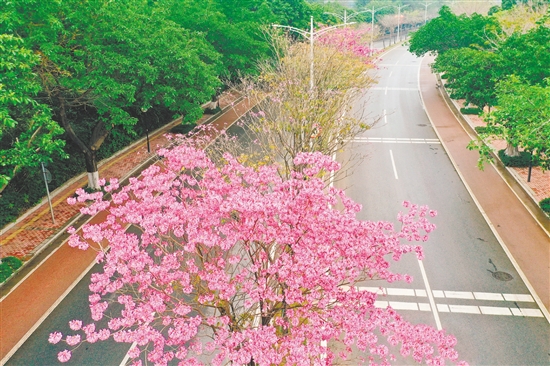 为提升龙湾路作为城市重要出入路段的绿化景观,蓬江区城市管理和综合执法局在龙湾路中间绿化带种植了约300棵紫花风铃木,并对道路沿线的杂草杂物进行了全面清理,同时对绿化带进行补种。此外,该局还以江门市花簕杜鹃为主题,对龙湾路与江门大道辅道交会处的4个分流岛以及龙湾公园邻近道路一侧的边坡进行了景观提升,增设微景观节点,旨在打造“一路一特色,四季有花赏”的城市风景线,为市民提供更加优美宜人的出行环境。