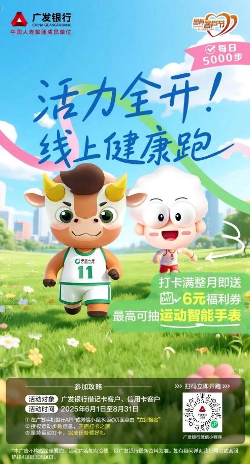 在“健康中国”战略蓝图深入实施与“体重管理年”科学理念广泛普及的当下,广发银行积极响应时代号召,依托第十九届“国寿616”客户节,特别推出全新“活力全开”线上健康跑活动。活动创新采用 “5000步日常渗透+场景运动化”模式,精准对接职场人、银发族等群体的实际需求,量身打造触手可及的科学运动方案,把运动融入日常点滴,日常通勤、买菜遛弯、做家务都能变成健康打卡,让每个人都能够轻松拥抱活力生活。