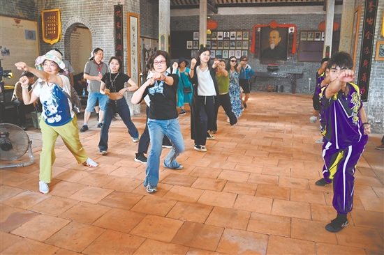活动首站,交流团团员便开启了一场沉浸式的文化与生活体验之旅。在京梅村缘福陈公祠内,台湾同胞怀着浓厚兴趣,在蔡李佛拳师傅的指导下认真练习。一招一式间,既有初学者的生涩,更有跨域共鸣的惊喜。“在台湾也接触过一些拳法,这次学蔡李佛拳,动作、出拳方式竟和家乡的武术有相似之处!”来自台湾台南的吴妤萱边学边感叹,“中华文化真是博大精深、源远流长。”