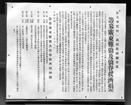 1931年9月18日,日本关东军蓄意制造的九一八事变,成为日本帝国主义发动侵华战争的开端。海外华侨的爱国热情瞬间被点燃。记者从中国侨都华侨华人博物馆了解到,当年9月20日,以台山籍华侨为主的美国旧金山中华总会馆率先行动,召开全侨大会,致电南京国民政府,强烈表示:“日寇强占我东三省,全侨愤慨,请即息内战,御外侮,挽危亡,愿作后盾。”由此吹响支援“第一哨”,海外华侨支援祖国抗日的爱国救亡浪潮全面掀起。
